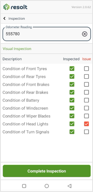 Vehicle Inspection A mandatory requirement for the driver to start and complete their routes An odometer reading is captured to track the starting and ending mileage for a route and is compared to planned route distances for operators’ scrutiny Drivers are required to mark all items indicating they have been inspected and are able to mark any of the items with an issue |